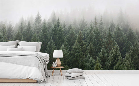 Satisfaction GuaranteedClouds hang just above the treetops of a frosty forest. The deep green trees give rise to a white mist, creating a high impact and texturally interesting wall mural. Available in both removable peel-and-stick and permanent wallpapers. Printed with child-safe inks.