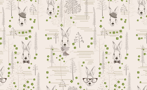 Satisfaction GuaranteedLighthearted rabbit heads variously adorned with bow ties, hats, eyeglasses and scarves, plus a sprinkling of cloverleafs. Cream background. Available in both removable peel-and-stick and permanent wallpapers. Printed with child-safe inks.