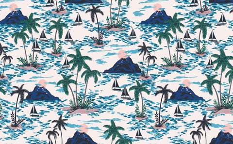 Satisfaction GuaranteedVintage tropics, with blue mountain islands, palm trees, peach suns and black sailboats with blue seas, on a white background. Available in both removable peel-and-stick and permanent wallpapers. Printed with child-safe inks.